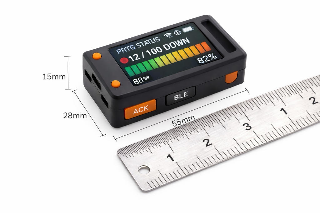 This device connects directly to your PRTG server over Wi-Fi, displaying critical alerts, sensor status, and notification summaries directly on its 1.14-inch color screen. Configuration is simple and secure using the companion Bluetooth mobile app for Android and iOS — no computer required.