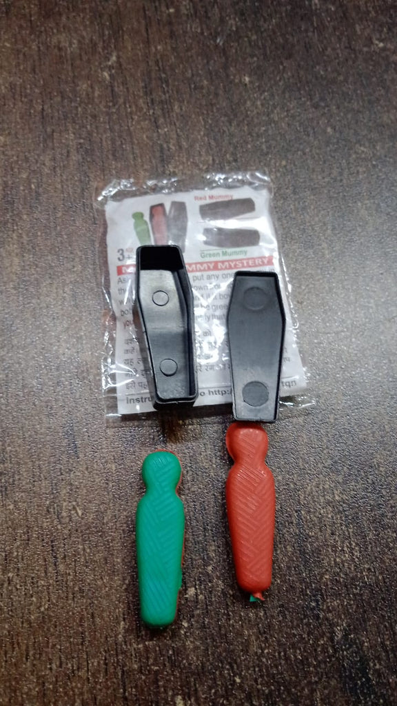 MAGIC MUMMY MYSTERY Ask the audience to put any one mummy in the box. If the box bows down from top side then it will be red mummy and if it bows down from bottom side then it will be green mummy. And you will be able to identify that.